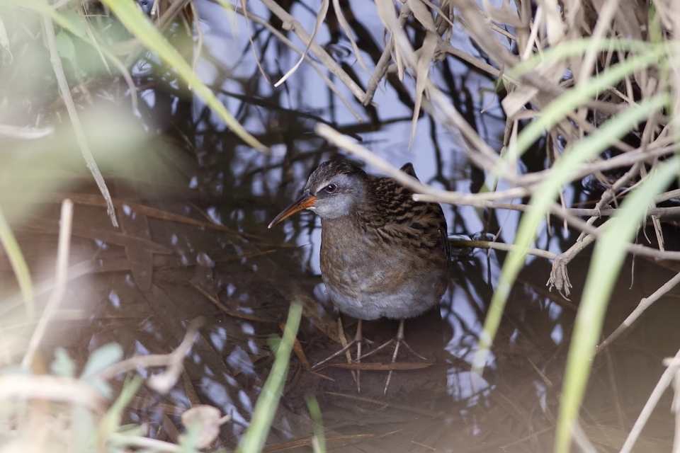 近所の河川堤防を歩いていると、草むらからクイナが顔を覗かせました。